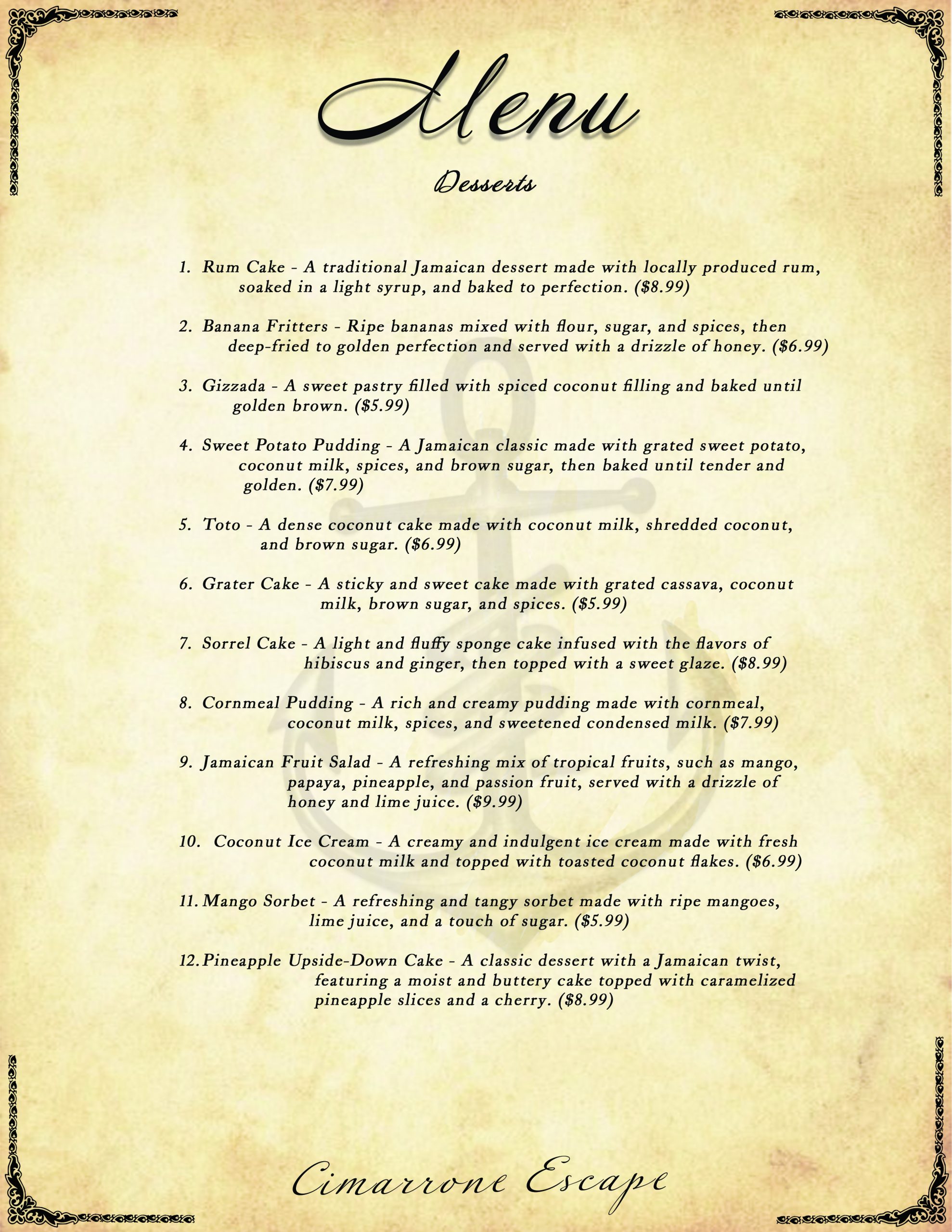 Indulge in our selection of decadent desserts, perfect for satisfying your sweet tooth after a delightful meal aboard the Adonia yacht. Choose from our delectable Jamaican-style bread pudding, made with local fruits and spices, or our creamy coconut flan, a tropical twist on a classic dessert. For something a little more decadent, try our rich chocolate rum cake or our velvety smooth cheesecake topped with fresh fruit.